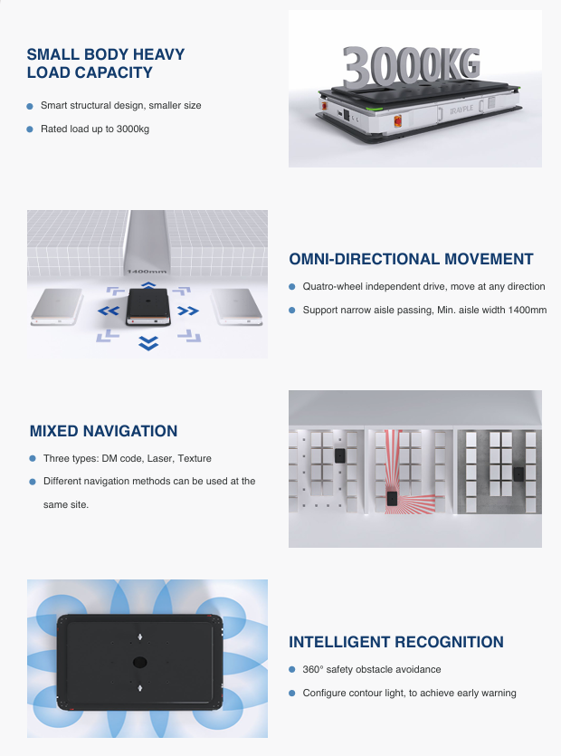 ออกแบบโครงสร้างแบบโมดูลาร์ เพิ่มความทนทานและบำรุงรักษาง่ายทั้งระบบ ใช้ระบบขับเคลื่อนแบบเคลื่อนที่ได้รอบทิศทาง ช่วยลดข้อจำกัดด้านพื้นที่ทางเดิน และเพิ่มประสิทธิภาพในการขนย้าย